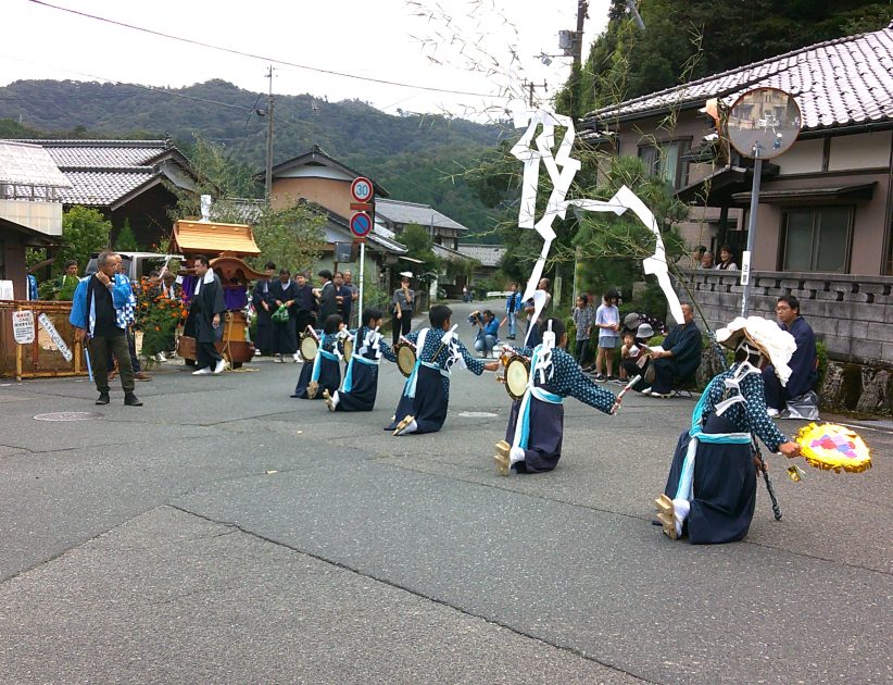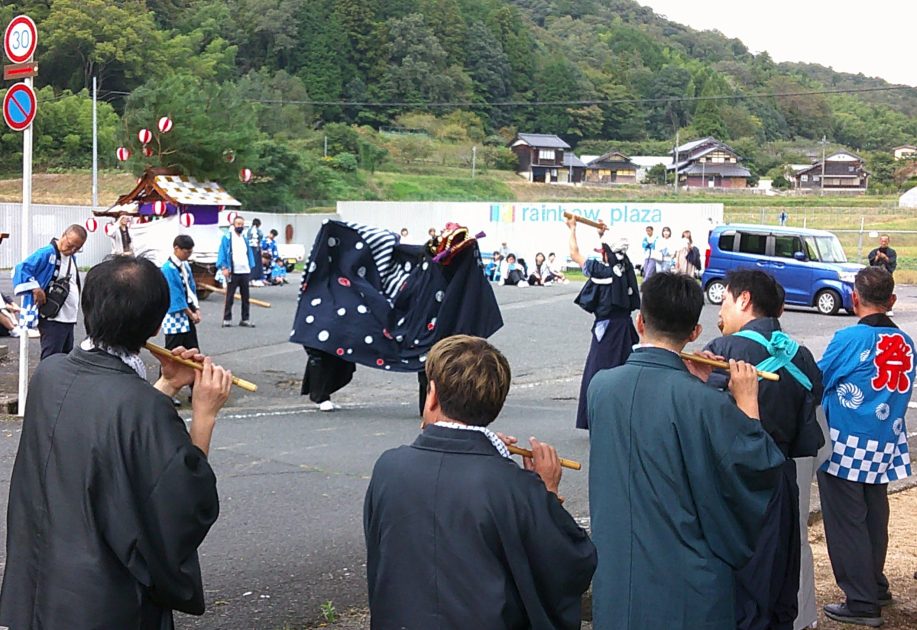 太鼓の音や笛の心地よい音色が村中(むらぢゅう)に響きわたり、老いも若きも総出演、一年でいち番にぎやかな一日になりました。