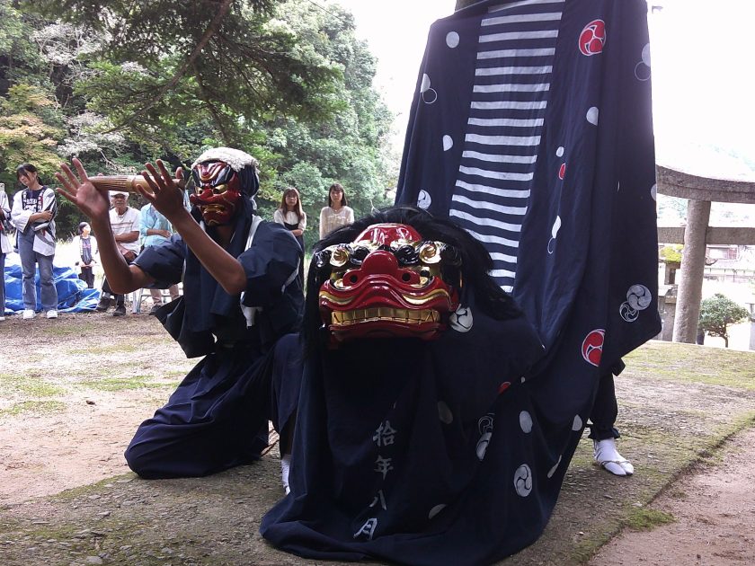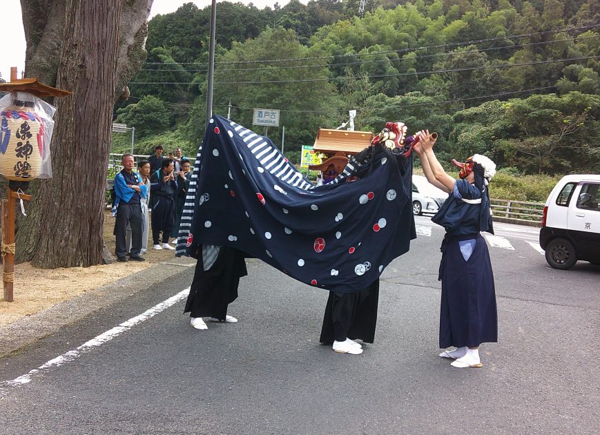 夏日のような暑い日、汗ダクになり約2㎞の集落内を巡行。子どもを中心にした「笹ばやし」と「楽(がく)」、そして大人が演じる「神楽(かぐら)」の三つの演目を、上、中、下三重の3か所で披露。最後に三重神社におごそかに奉納しました。