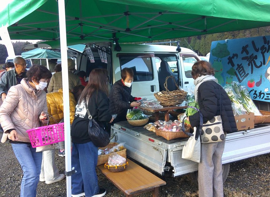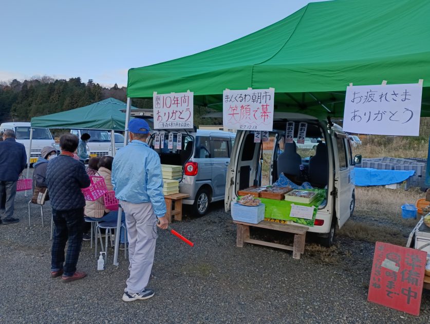 最後となった12月13日、寒い日になりましたが、いつものように高速道路橋脚横に張ったテントに軽自動車3台が縦並び。大根や白菜、里芋など野菜類のほか、ぼた餅や栗おこわ、コンニャクの加工品を荷台に乗せ販売しました。