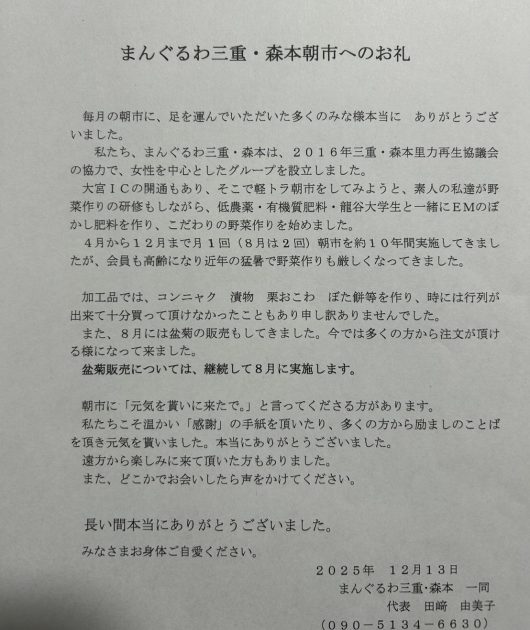 朝市は終わりますが女性グループ「まんぐるわ三重・森本」はまだまだ元気です。これからもよろしくお願いします。